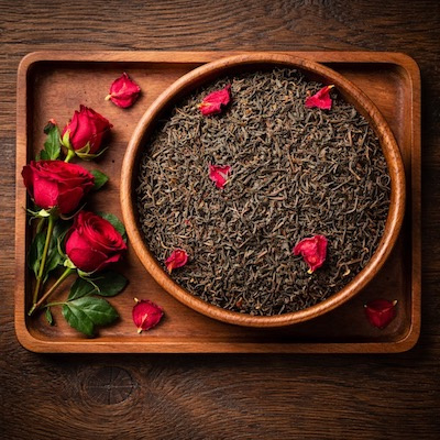 OverzichtZwarte thee gearomatiseerd met rozenblaadjes.
