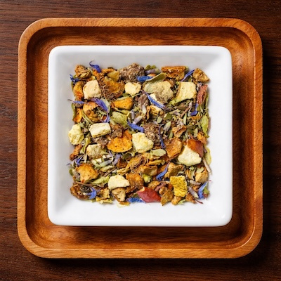Appel stukjes, perzik stukjes, citrusschil, pepermunt, melisse, hop, lavendel bloesems, valeriaan, thee bloesems en korenbloem bloemblaadjes.