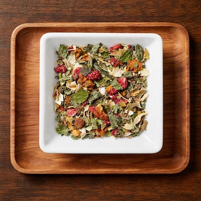 | Ingrediënten | Appel stukjes, snijboon schillen, brandnetel bladeren, bessen bladeren (bramen bladeren, zwarte bessen bladeren), nana mint, aardbei stukjes, aroma. |