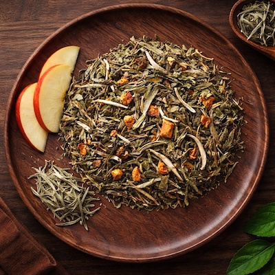 OverzichtGroene thee met zoete appel en het verfijnde van een Silver Needle thee.