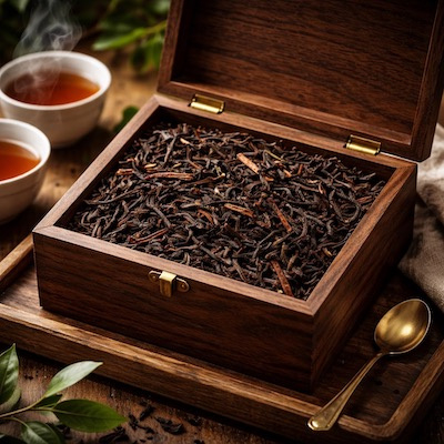 Kistje van de KeizerEen melange van Assam, Ceylon en Lapsang thee. Het geeft een donkere drank die pittig smaakt.
